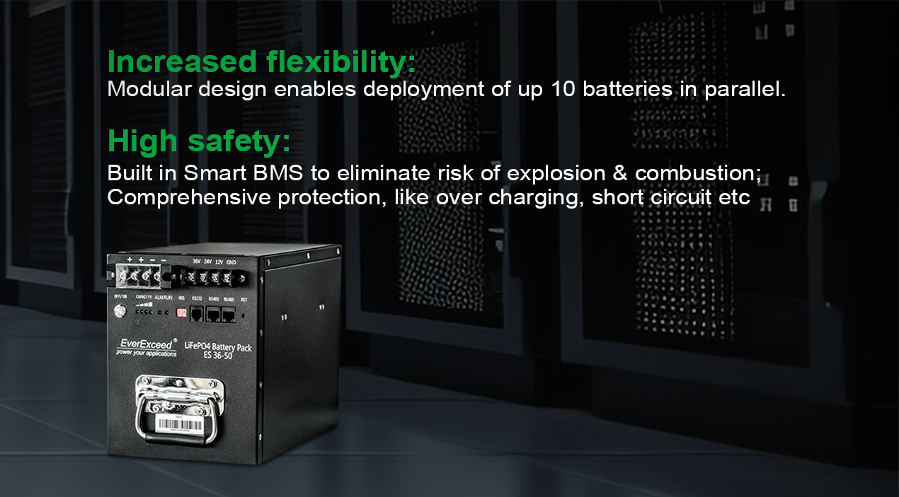 6000+ life cycles, 10 times more than the traditional Lead-acid battery | Modular design enables deployment up 10 batteries in parallel | Can withstand in -20°C ~ +60°C | ||